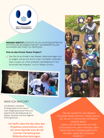 Das EMOTO PIECE PROJECT erklärt Kindern in spielerischer Weise, dass die Art des Umgangs miteinander, Einfluss auf den Körper hat. Dazu gibt es ein Büchlein, was aufgrund der Spenden, die ich dafür bekomme, kostenlos verteilt werden kann.